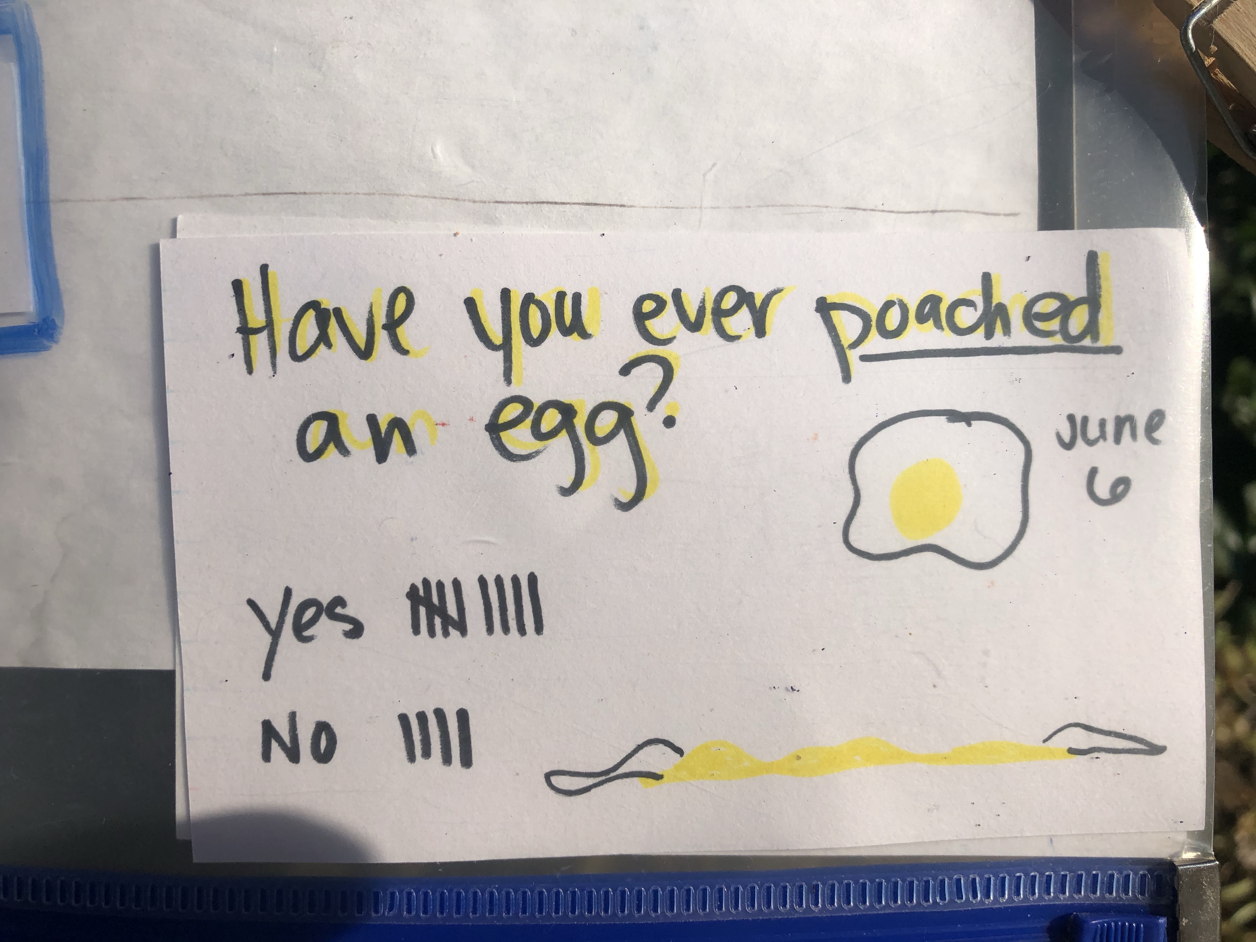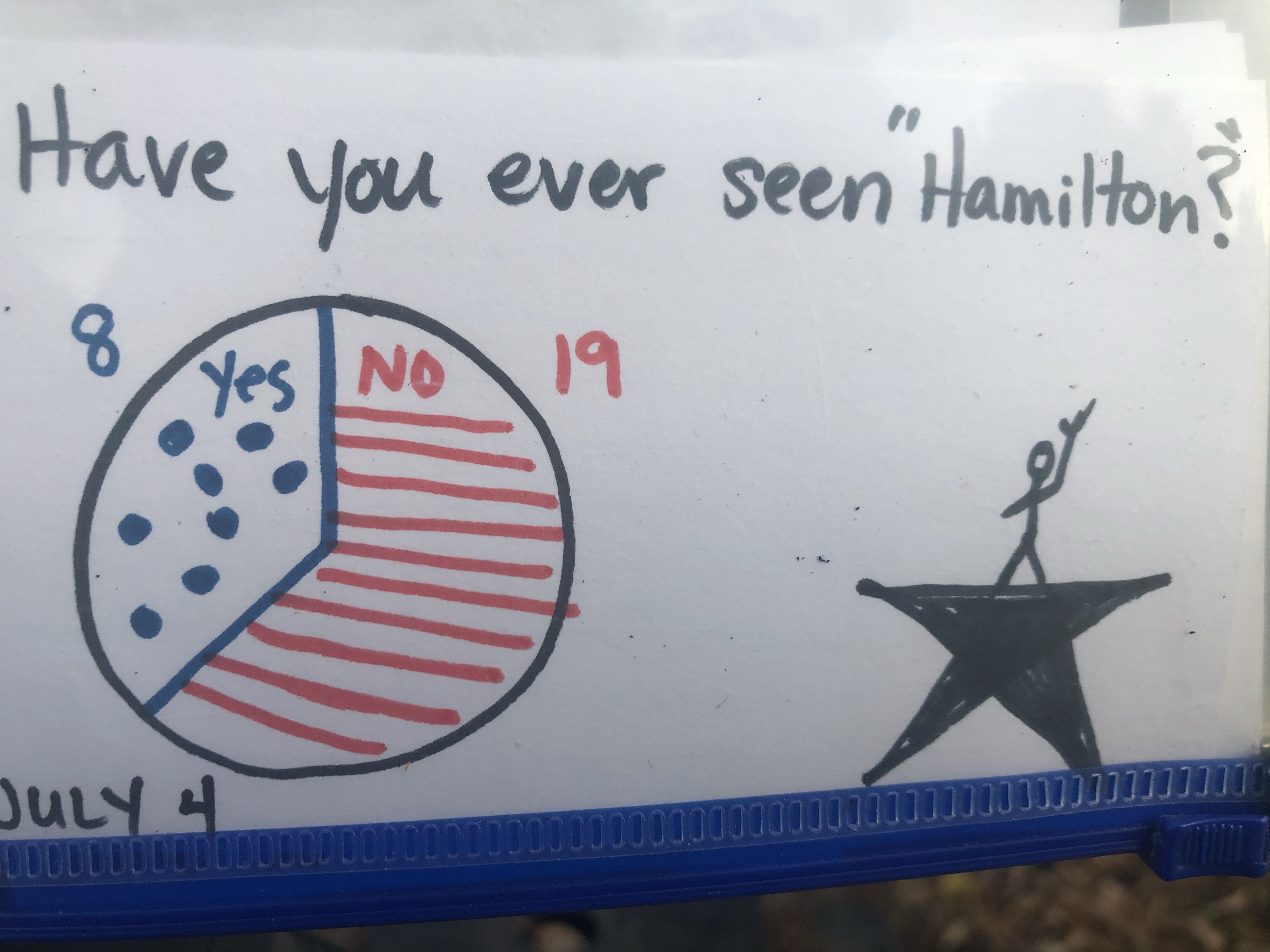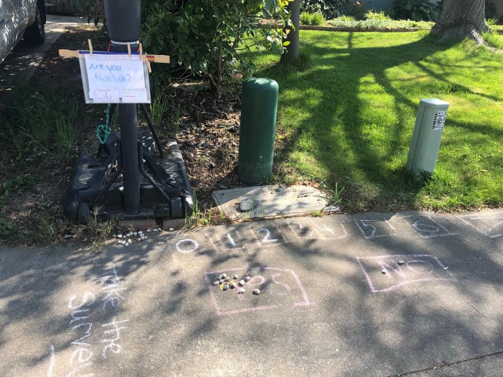 Each afternoon we put out a new question on the clear pocket folder. People walking by can cast their Yes/No or numbered vote with a stone in one of the chalked squares. Since this is a “no-contact” survey, they can use their foot to move a stone from the pile.